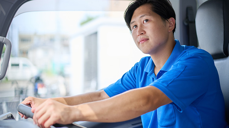 埼玉・千葉エリアを中心に、おしぼりをはじめ、マット、モップ、ユニフォームクリーニングの配達と回収を担当しています。朝5時ごろに出社して、トラックに商品を積み込み、曜日ごとに決められたルートに沿ってお客さまを回ります。年に2回開催される雑貨販売のキャンペーンのときには、お客さまに洗剤やトイレットペーパーなどのキャンペーン商品をご案内。お客さまから「秋本くんの頼みなら仕方ないな。買うよ」と言われたときはうれしかったですね。
